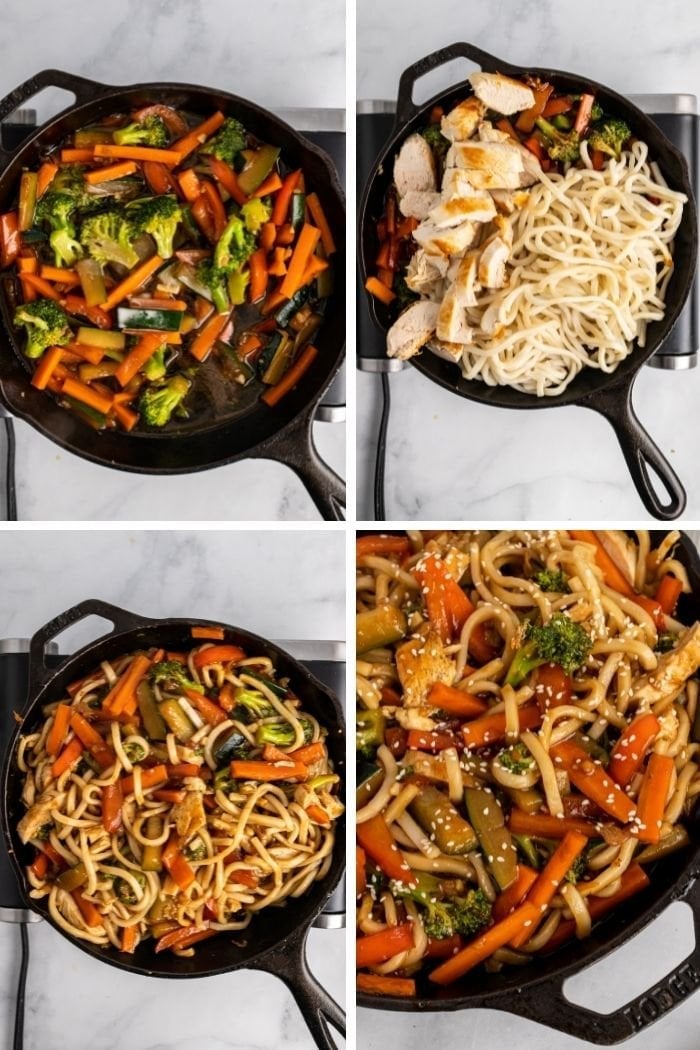 step seven: add the noodles and chicken back to the pan with the vegetables and stir to fully coat