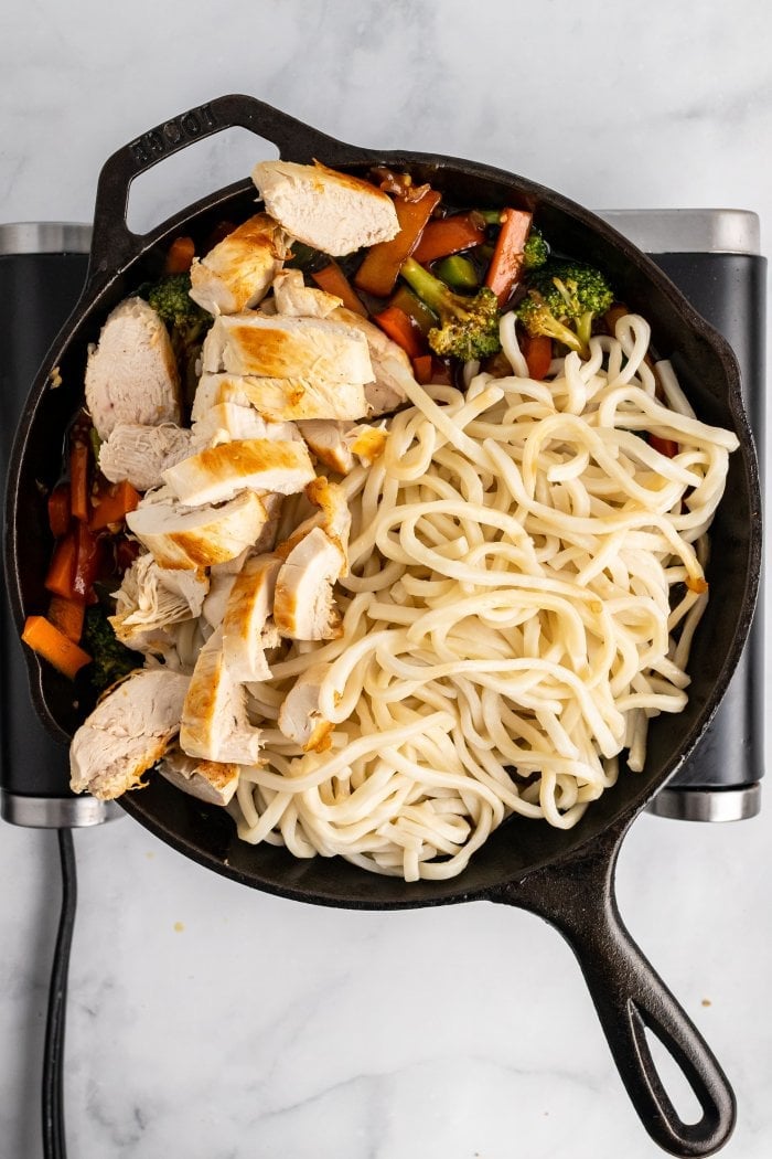cut the chicken into slices, then add it to the vegetable mixture along with the cooked udon noodles; stir to fully coat everything