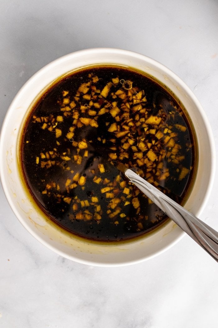 step three: prepare the teriyaki sauce by stirring together the broth, soy sauce, brown sugar, remaining olive oil, sesame oil, ginger and garlic