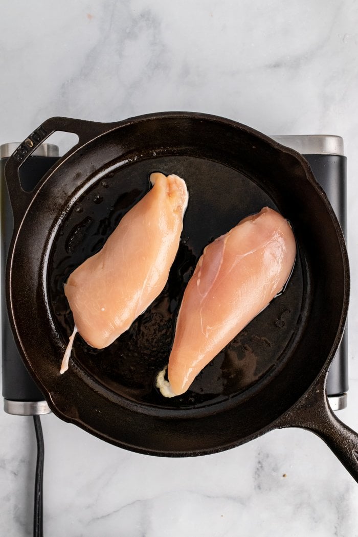 step two: while the noodles are boiling, heat some olive oil in a large skillet and cook chicken breasts until fully cooked, the set aside