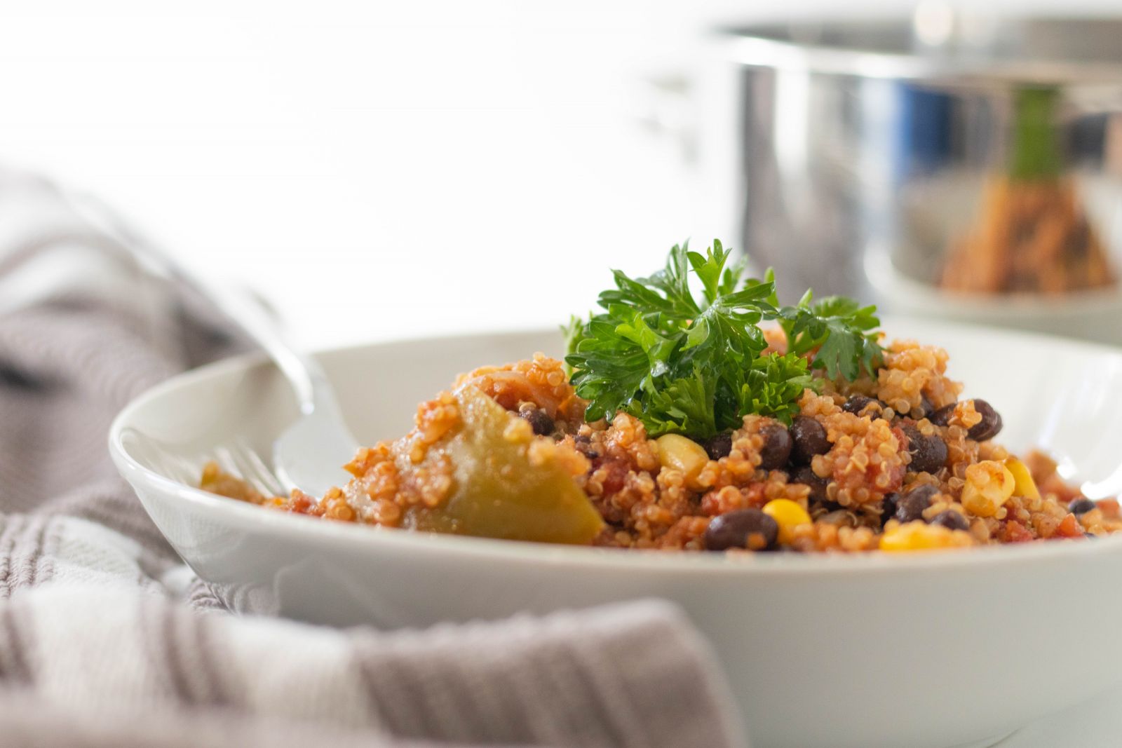 If you want a quick, easy, healthy, weeknight dinner then you have come to the right spot! This one pot mexican quinoa is vegan, healthy, and requires minimal prep work. The whole family loves this when I make it. It is so flavouful, and it keeps you full for a long time because it has a lot of protein from the quinoa and beans!