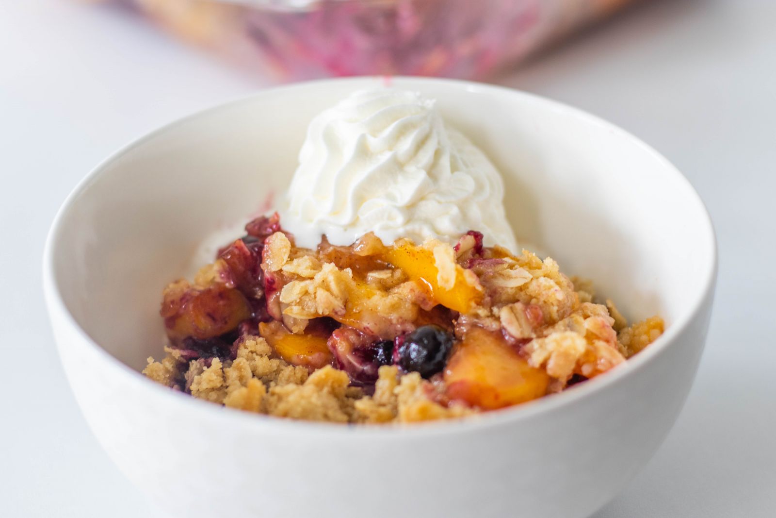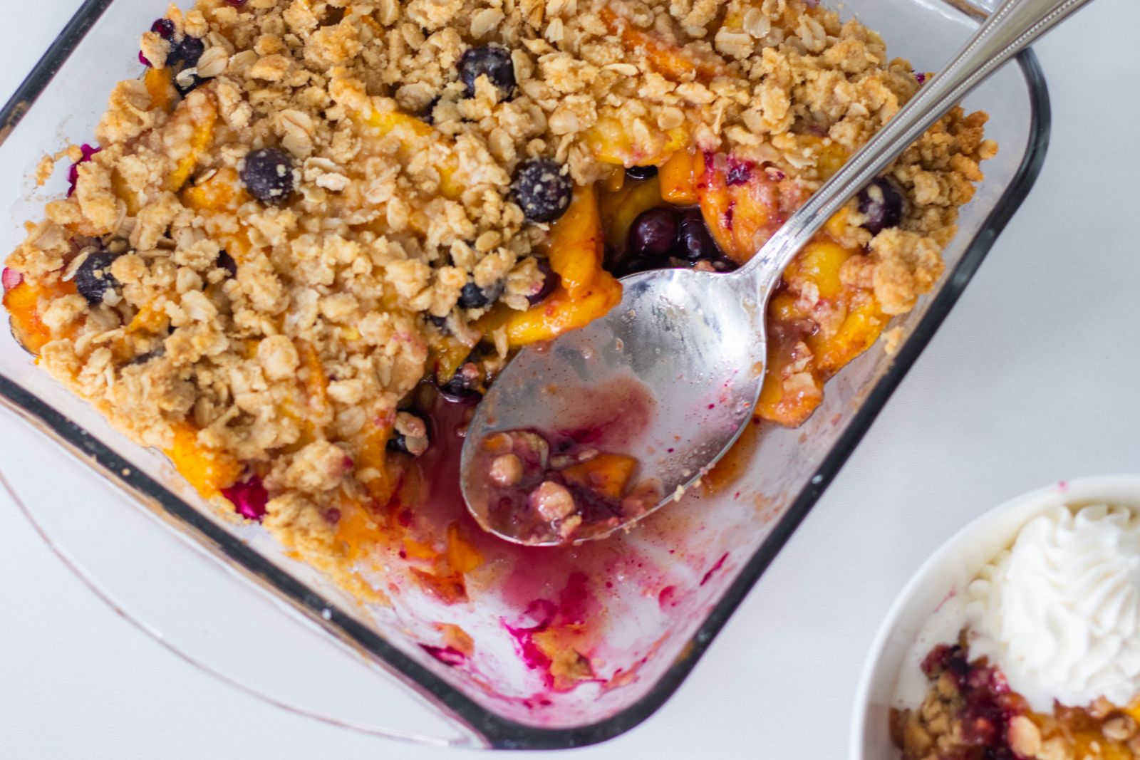 Summer has some of the best seasonal fruits. Not much is better than biting into a nice, juicy, peach on a hot summer day... except maybe digging into a peach-based dessert. Thank goodness it is peach season in Niagara! Mango gives a unique but delicious twist to this fruity crisp. I had never heard of a pie or crisp with mango in it before, but I looked at my fruit bowl and thought "why not?". To be completely honest, mango baked in with this crisp is game changing. You simply must try it for yourself.