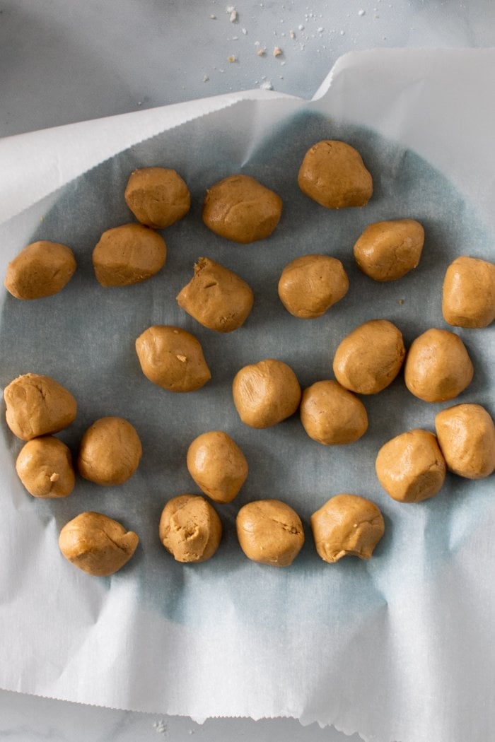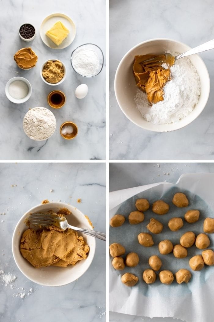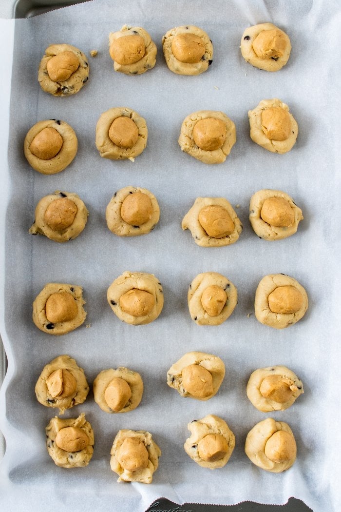 Portion the peanut butter mixture into 24 equal balls, then place into freezer while you prepare the chocolate chip cookie dough