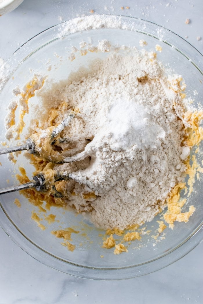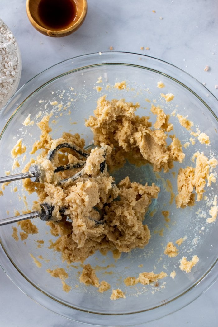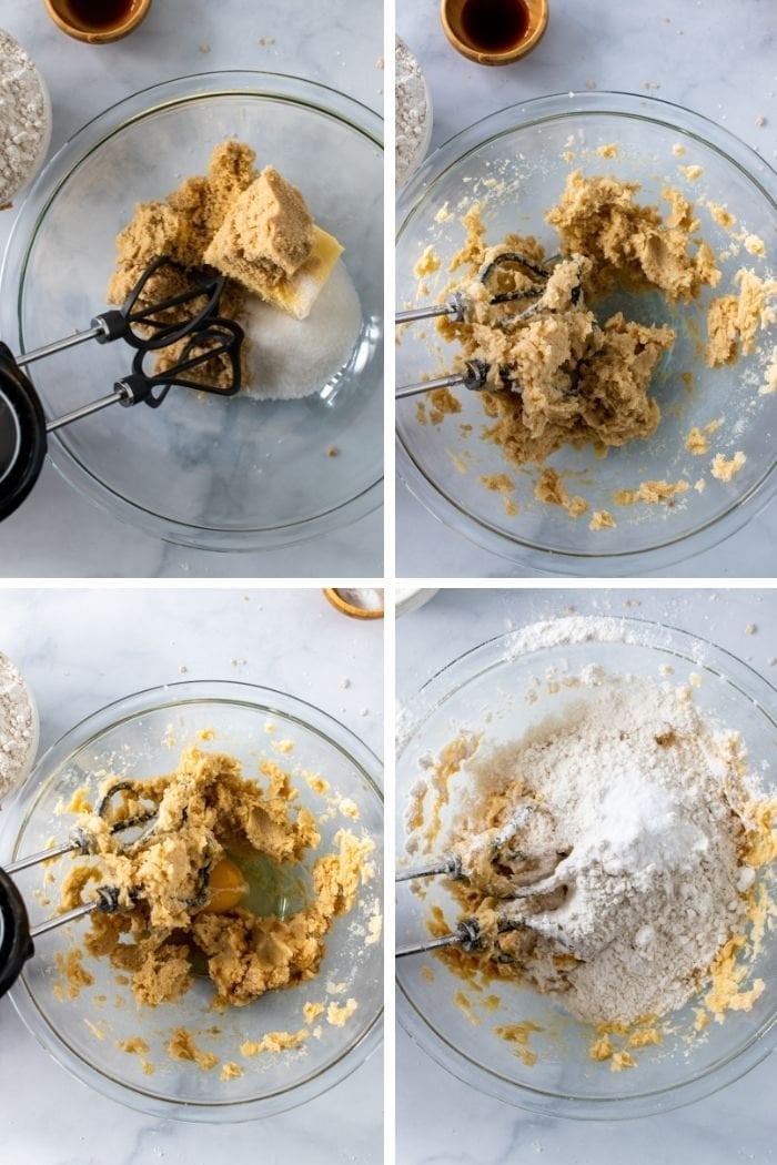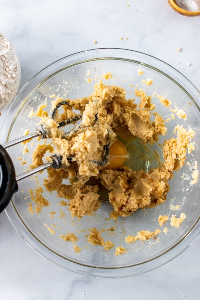 step four: beat in the egg and vanilla, followed by the flour, baking soda, and salt