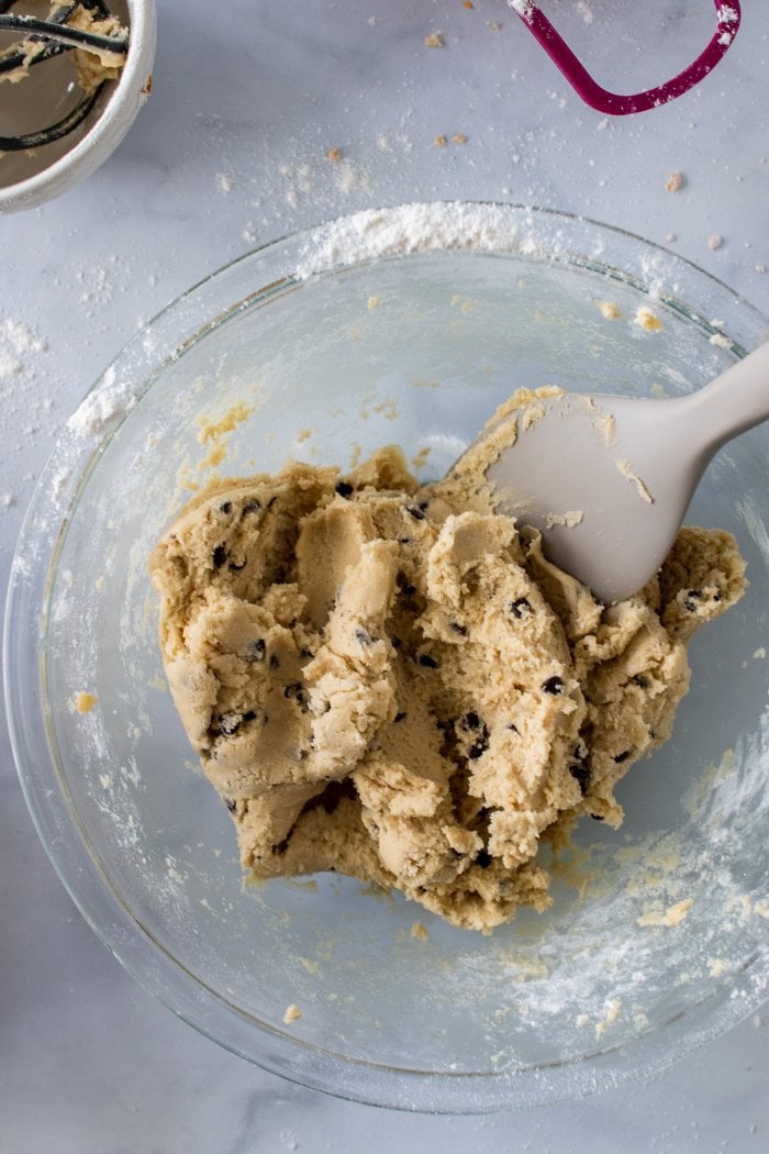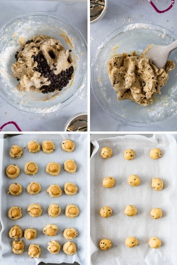 Stir in the chocolate chips, then portion the cookie dough into 24 equal cookie dough balls