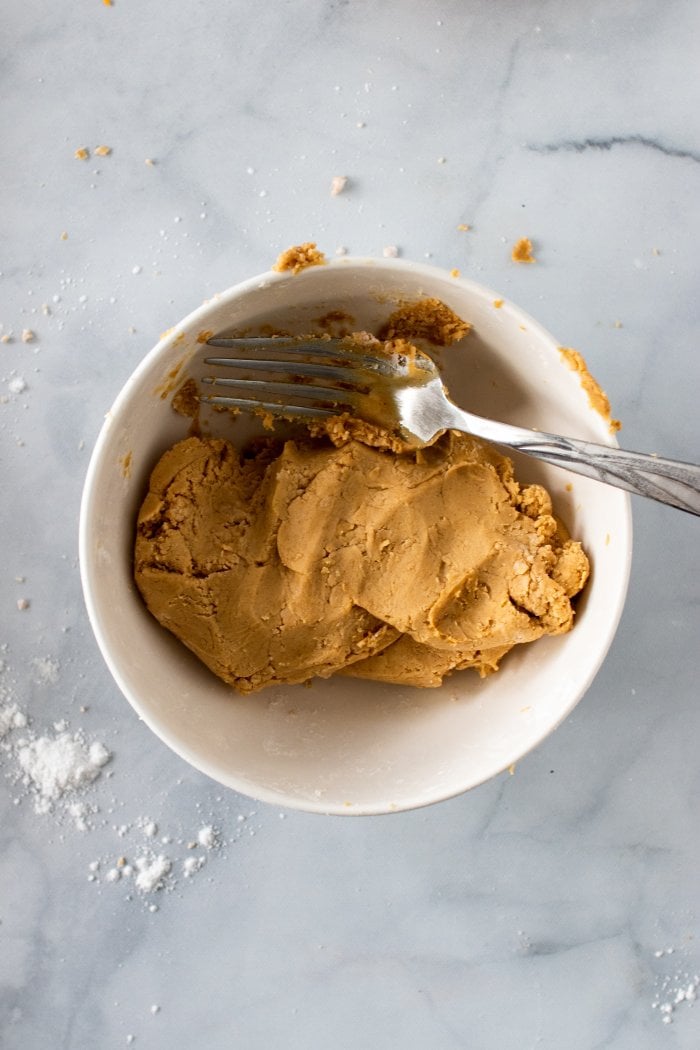 In a small bowl, mix peanut butter and powdered sugar until completely smooth, the texture will be somewhat like playdough