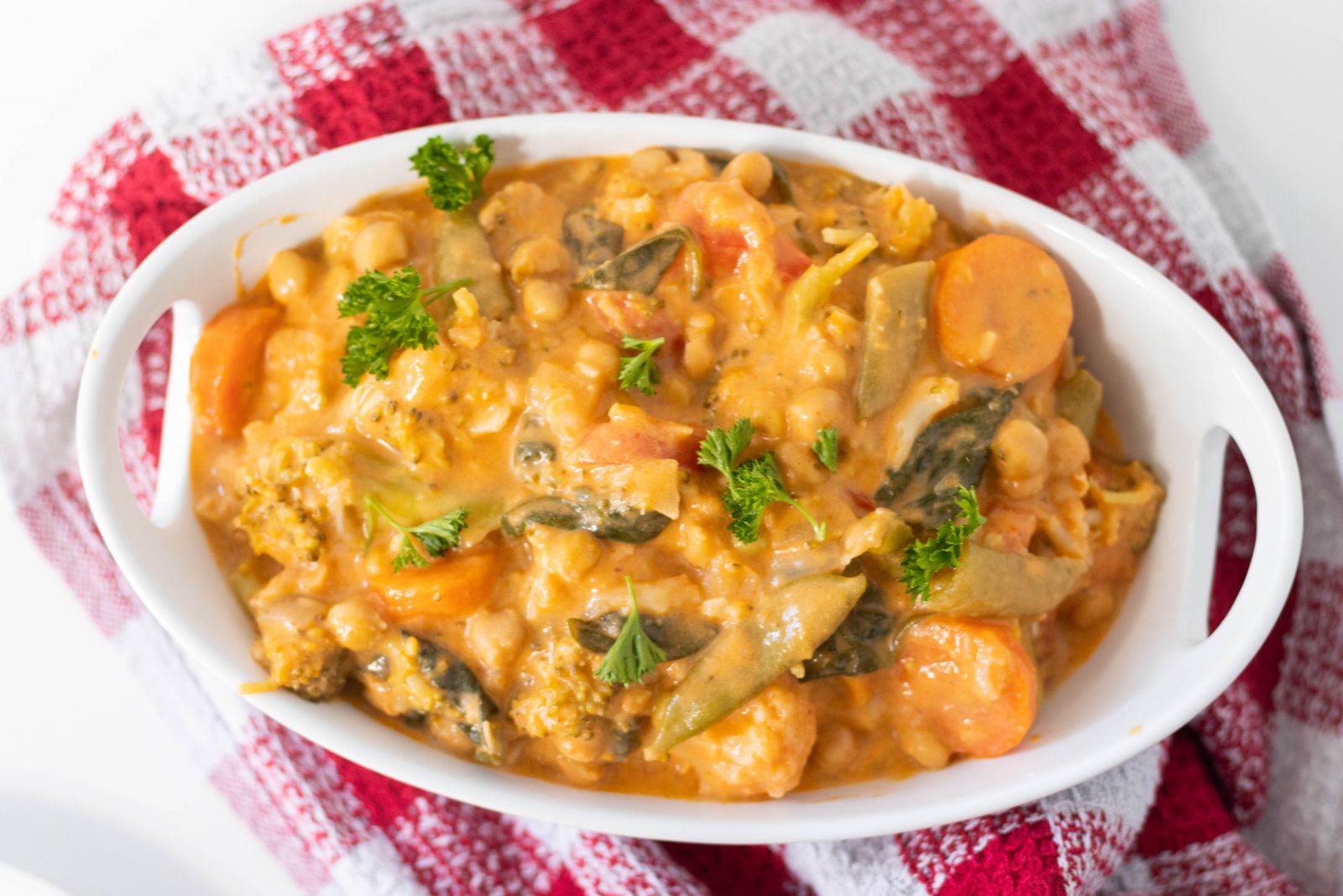 Broccoli Carrots Cauliflower Chickpeas Coconut Milk Garlic Ginger Onions Peppers Red Curry Paste Snap Peas Vegetable Broth