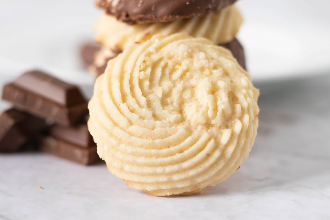 I hope you aren't sick of cookie recipes yet, because here is another delicious, holiday cookie recipe I have been making on repeat this past month! These shortbread cookies are melt in your mouth delicious! I included them in my holiday cookie box this year, they're just so pretty! You can dip them in chocolate, or leave them plain - either way they are delicious! These cookies are relatively simple to make provided you have the right tools. You will need electric beaters, or a stand mixer, as well as a piping bag and a large piping tip. I prefer to use Wilton 8B tip, however any large open tip will do the trick. You will also need a non-stick unlined baking sheet to bake the cookies on.