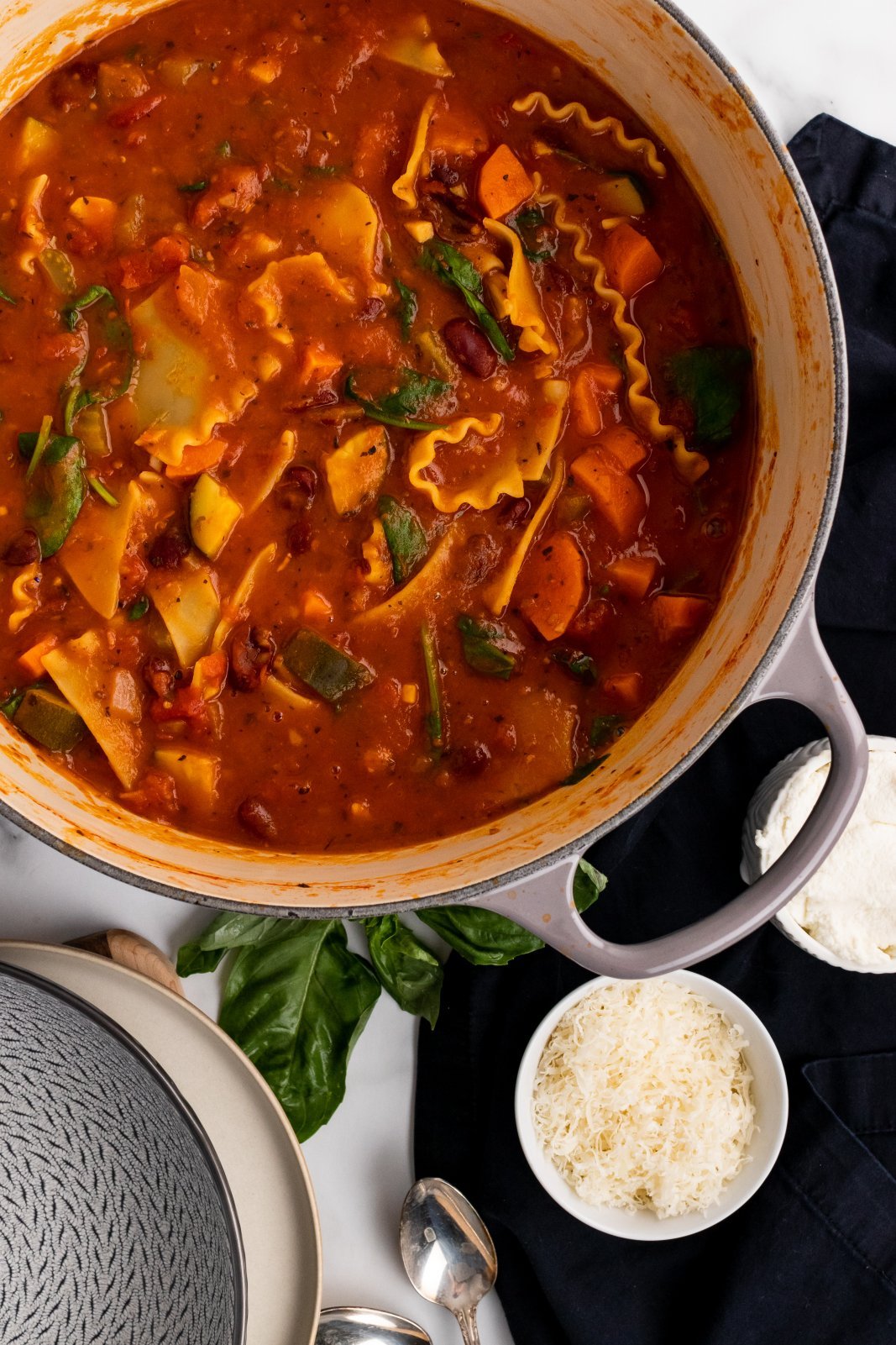 Lasagna soup is exactly what it sounds like; all the flavors of lasagna in one easy-to-make, thick tomato soup. I like to keep my broth thick, almost like an abundance of tomato sauce, but you can make it thinner by adding a little extra broth at the end of cooking if you prefer.